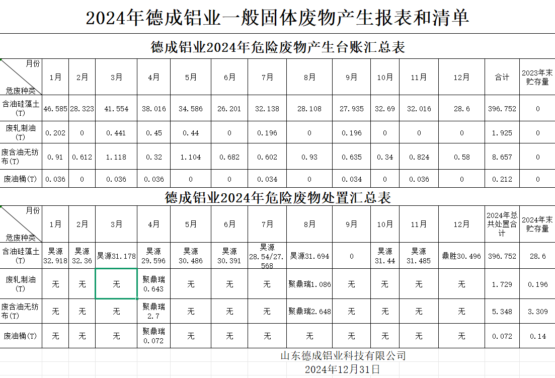 2024年德成鋁業(yè)一般固體廢物產(chǎn)生報(bào)表和清單